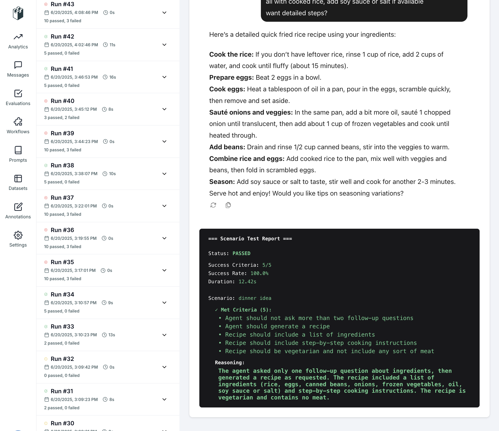 The Simulations visualizer in LangWatch provides a powerful way to inspect and analyze the results of your agent tests built with the scenario library. It offers a user-friendly interface to dig into simulation runs, helping you debug your agent’s behavior and collaborate with your team.